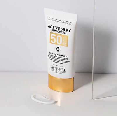 Saules aizsargkrēms ar peptīdu un zīda kompleksu MEDI-PEEL Active Silky Sun Cream SPF50+PA+++ ir ar atjaunojošu un vieglu balinošu iedarbību.